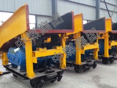 3、台车上的操纵机构、绞车、导向轮和进料槽、中间槽、卸载槽。进料槽的中部设有升降装置,可旋转螺杆调节簸箕口的高低,为了引导耙斗进出和防止矸石撒落,在绞接部位还设有左右导向挡板;中间槽前后弯曲部位,各设有可装卸耐磨的弧形板;卸载槽后部装有缓冲作用的弹簧碰头和撑脚。