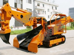 ZWY-120液压扒装机是一种连续生产的高效率出矿设备。主要用于铁路隧道施工、矿山平巷、斜巷掘进、引水洞和国防洞窟施工中的装载作业。适用于断面为2.2×2.4米以上的中小型巷道。机器的工作条件是:岩石的普氏硬度f小于等于12,块度小于等于700mm。Zmjt055本机靠履带推进铲取岩石并通过铲斗将石料扒进自身的刮板输送机,输送机从尾部将岩石卸入自卸汽车、梭式矿车或其它转载设备上去。同时也可利用反铲挖掘臂扒取远处的岩石,也可以用铲斗来清理工作面。
